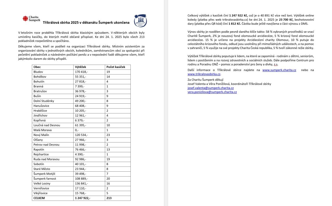 Tříkrálová sbírka 2025 proběhla tradičně v děkanátu Šumperk, kde občané přispívali do 213 pokladniček. Všechny byly rozpečetěny a spočítány k 24. lednu 2025. Sbírka se konala klasickým způsobem s umístěním kasiček v obcích.