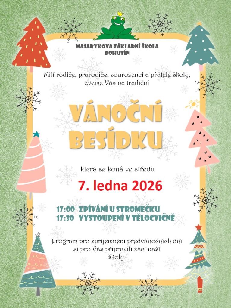 ZMĚNA - Masarykova základní škola v Bohutíně zve rodiče, prarodiče, sourozence a přátele školy na tradiční Zpívání u stromu a Vánoční besídku, která se Z DŮVODU CHŘIPKOVÉ EPIDEMIE přesouvá na 7. ledna 2026.