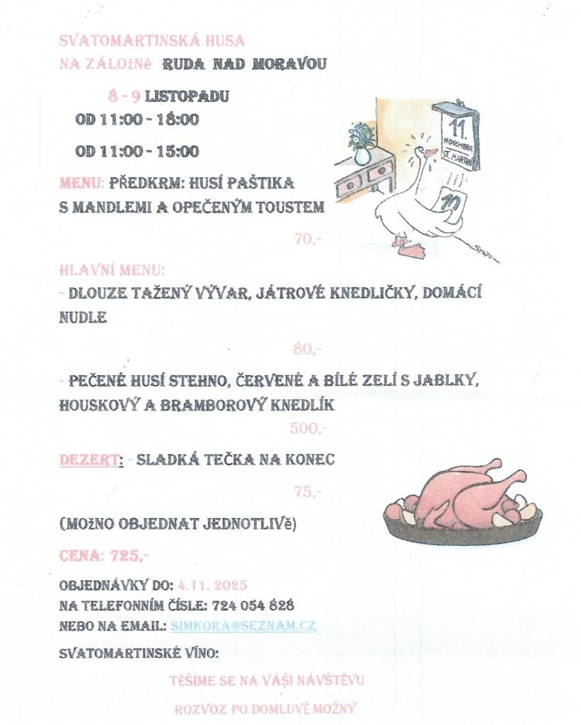 Restaurace Na Záložně v Rudě nad Moravou zve na Svatomartinskou husu. Ve dnech 8. a 9. listopadu 2025 si můžete vychutnat tradiční menu, které zahrnuje paštiku s mandlemi, polévku kaldoun, pečené husí stehno s červeným a bílým zelím a jablky, doplněné variací knedlíků. Na závěr je připravena sladká tečka. Pro více informací a objednávky volejte na 724 054 828 nebo pište na SIMKORA@SEZNAM.CZ.